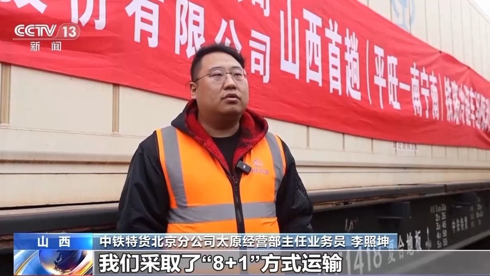 中铁特货北京分公司太原经营部主任业务员 李照坤:我们采取了“8+1”方式运输。这种冷藏箱自重小、载重大、降温速度快,能在-30℃至30℃间精准控温,完全满足了这批货物需要-18℃运输的要求。