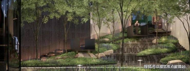 穿过公园的疏林大道,就是西侧主入口,首先映入眼帘的是高约6米的水幕,和下沉式的山水庭院,然后便可进入下沉会所.