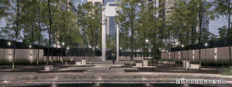 东向主打大尺度尊崇感,作为车行人行主入口,五重归家礼仪迎接业主回家:“植物园画框”式入口门头,长约67米、高约6米,迈入大门的一瞬间,犹如走进画中.