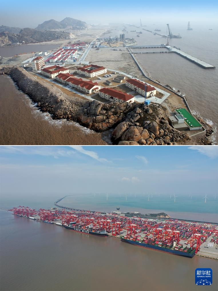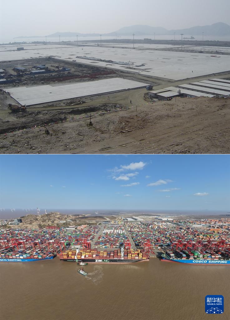 拼版相片:上图为2005年3月1日拍照的上海洋山港一二期工程;下图为2025年12月8日无人机拍照的上海洋山港一二期码头。