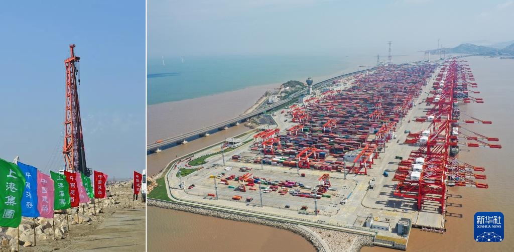 拼版相片:左图为2014年12月23日,上海洋山港四期工程打下榜首桩();右图为2022年9月23日无人机拍照的上海洋山港四期自动化码头(记者 丁汀 摄)。