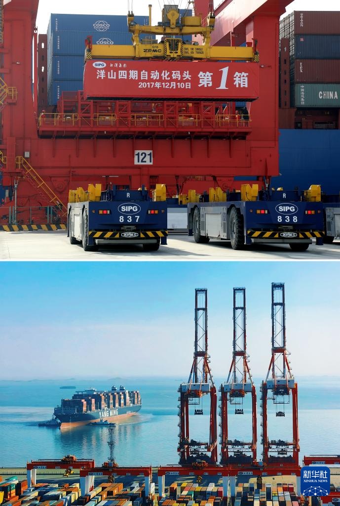 拼版相片:上图为2017年12月10日,上海洋山深水港四期自动化码头开港试生产;下图为2025年3月25日拍照的上海洋山港四期自动化码头。